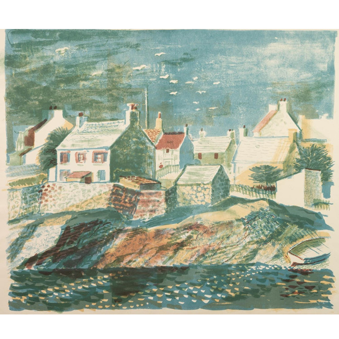 Moelfre in Anglesey was one of Norman Jaques’ favourite places and he depicted a range of views using different approaches to printmaking. This lovely bright lithograph captures a characterful view of the village from the sea, we also have the same print in a brown colourway, unframed.